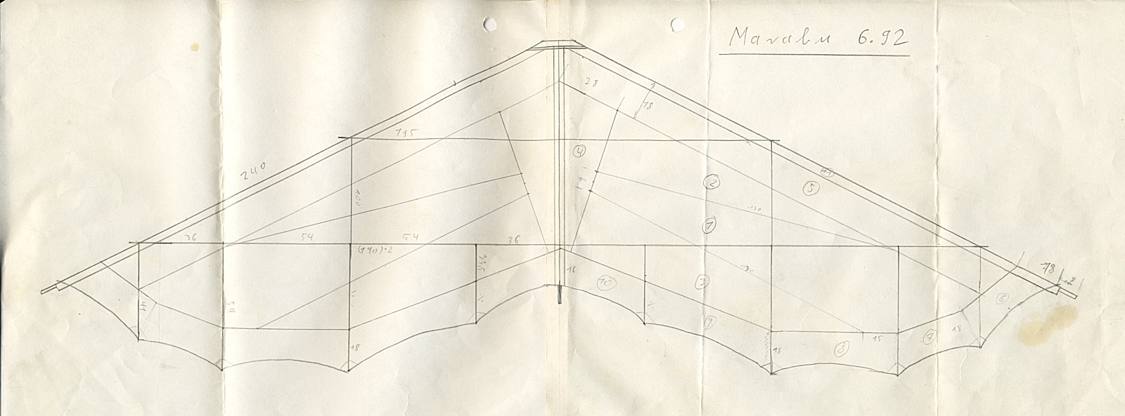 Daten, Fotos und Baupläne der selbst konstruierten Stab-Drachen: Marabu (Bambus Gestänge) Spannweite 430 cm Fläche 3 m² Gewicht 2665g (877 g/m²) Waage: 2 mal vierpunkt Segel-Hoehe (mitte) 107 cm SegelLatten 6mm / 8 mm GFK Rohr Eigenschaften: Gutmütig, grosse, aber berherrschbare Zugkraft Baujahr 06/1992