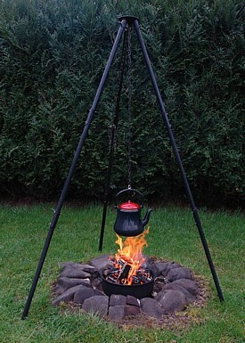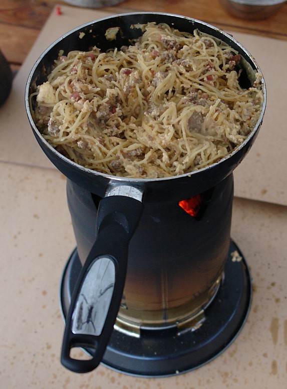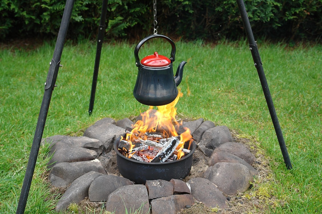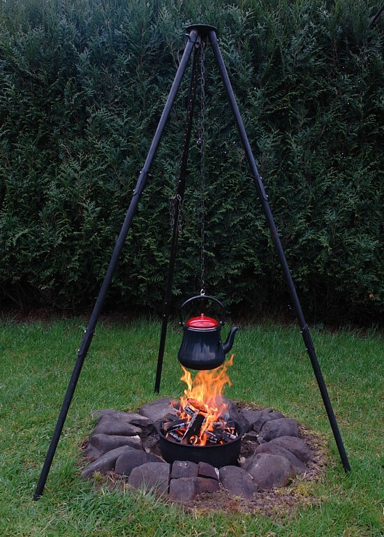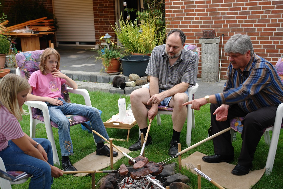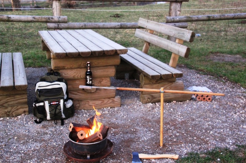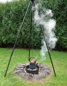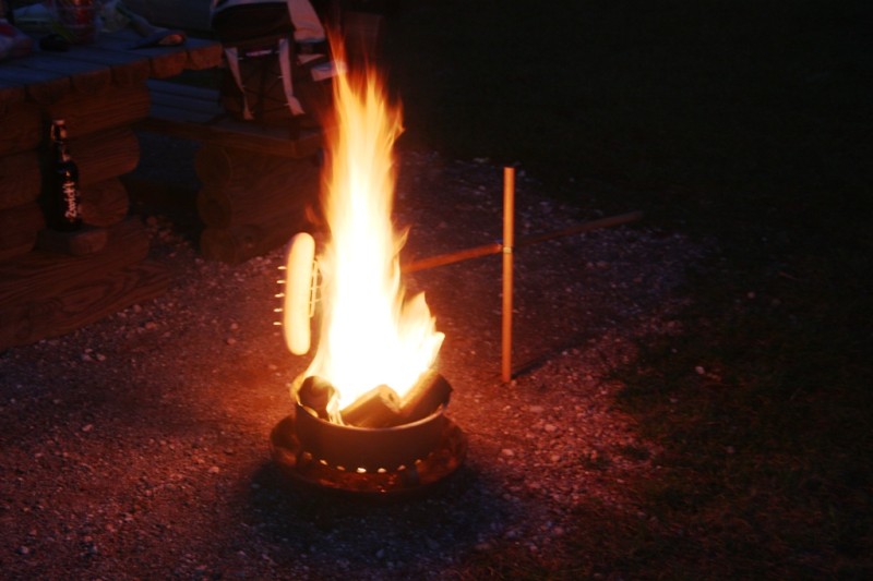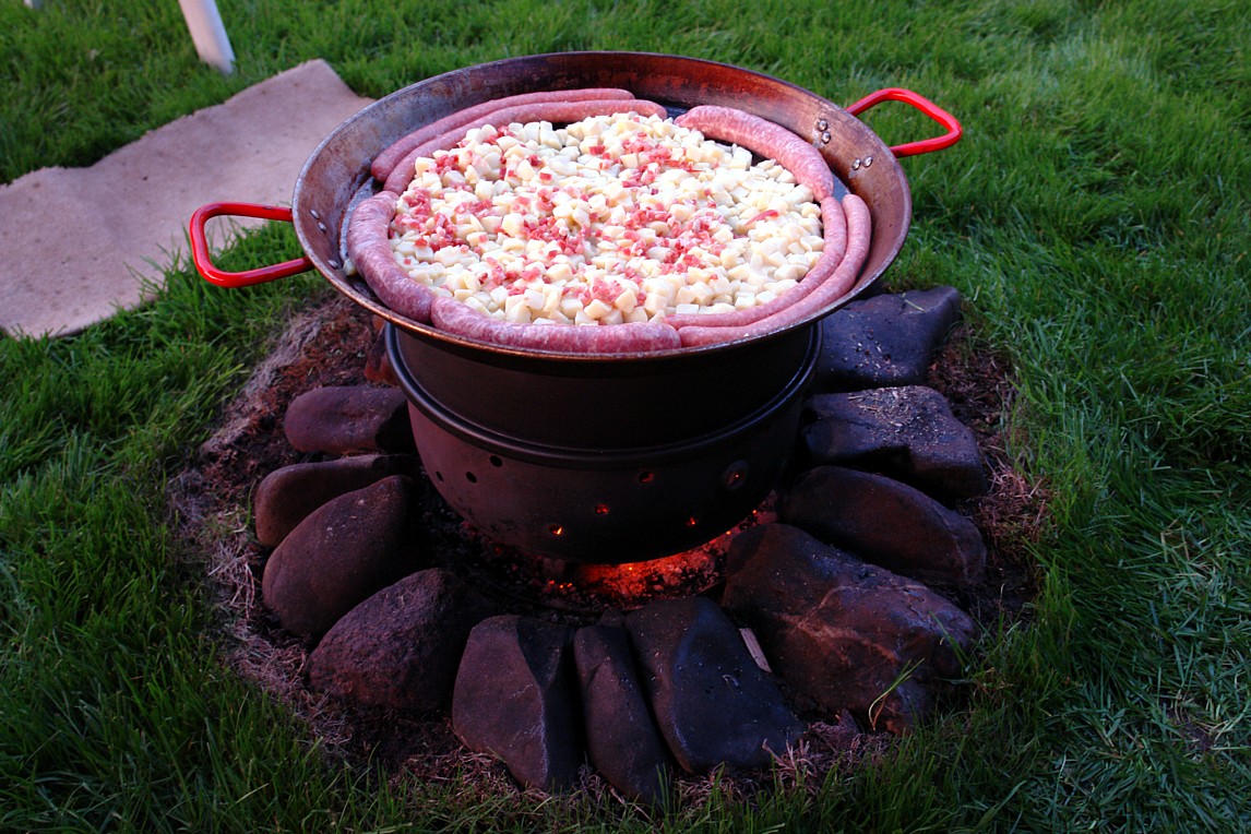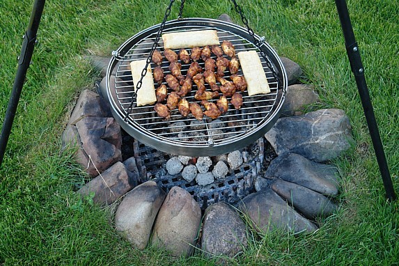 neben der offenen Flamme Baguett und Bratwurst: Ausrüstung: Kleine Feuerstelle, schwenkbare Grillforke auf Stativ Handhabung: Die Grillforke mit dem Grillgut wird knapp neben die offene Flamme gestellt. Ab und zu die Grillforke um 180 Grad drehen damit alles von beiden Seiten Braun wird. Direkten Kontakt zur Flamme unbedingt vermeiden. Abstand regelmäßig nachjustieren damit nichts anbrennt. (zum vergrößern auf Bild klicken) |