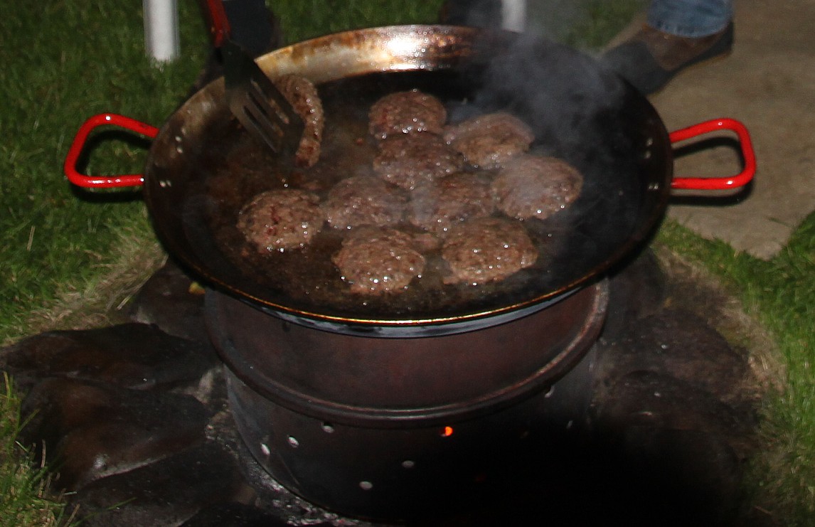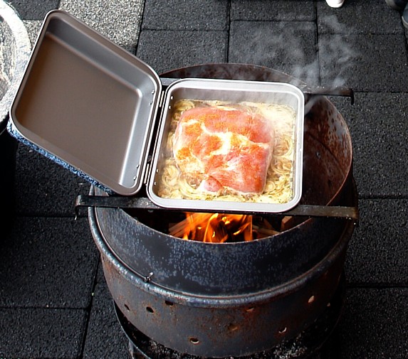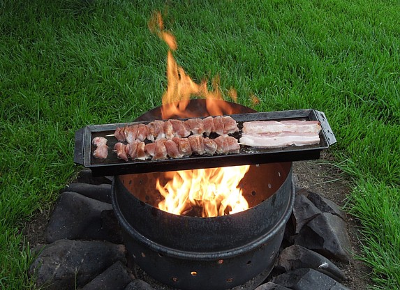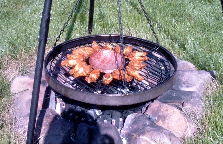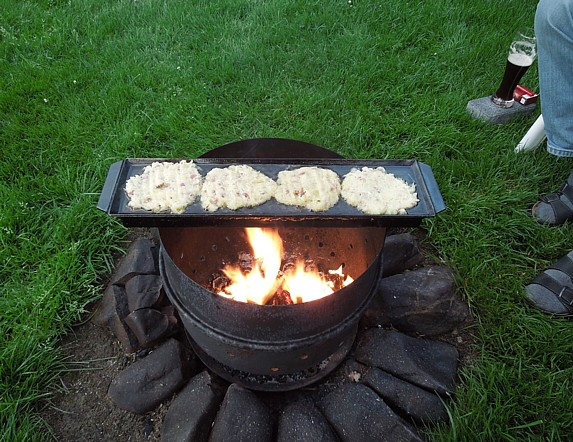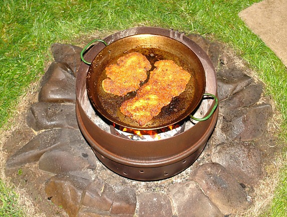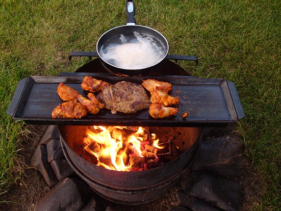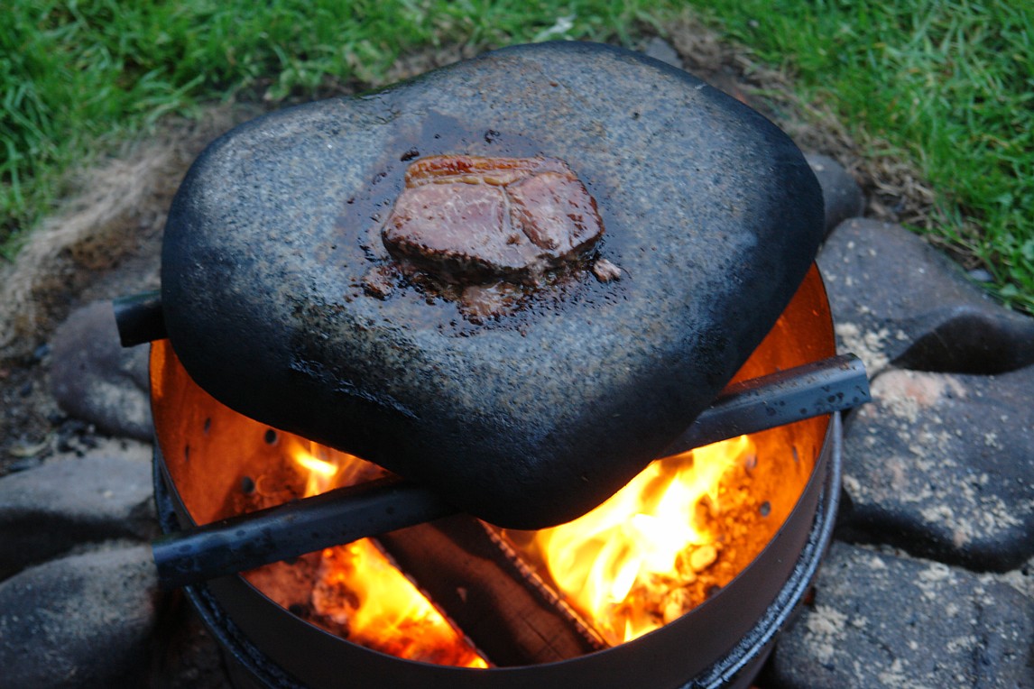 "Steak-Eisen" 1,5 Stück Hartholz-Briketts in kleine Stücke hacken und in den Feuerkessel geben. Anfeuerholz drüber, anzünden, Steakeisen drauf, einölen, nach 15 Minuten Fleisch drauf.Braten, mehrfach wenden, fertig. |