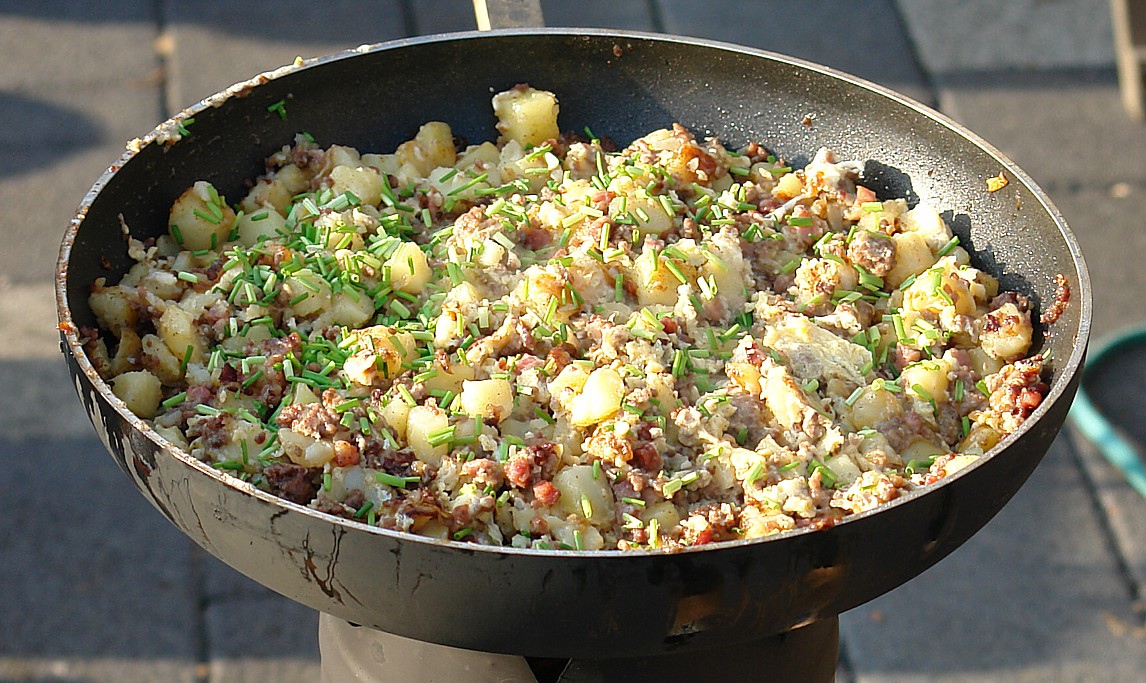 3 Personen Zutaten: 750g vorgekochte Kartoffelwürfel 400g Rinderhack 100g Schinkenspeck-Würfel 2 Zwiebeln 4 Eier 1-3 Knoblauchzehen (nach Bedarf) Schnittlauch Pflanzenöl (oder Butterschmalz) Salz Pfeffer Bratkartoffelgewürz Vorbereitung: Die Zwiebeln senkrecht halbieren (vom Kraut zur Wurzel) dann auf die flache Seite legen und in dünne Scheiben schneiden Die Eier in einer Schüssel verquirlen Schnittlauch klein schneiden Knoblauch klein schneiden Zubereitung in einer antihaft-beschichteten 32cm Pfanne: Öl in die kalte Pfanne geben bis der Boden komplett bedeckt ist Kochstelle kräftig anfeuern. Zwiebel in die Pfanne geben und kurz anschwitzen bis sie anfangen glasig zu werden. Schinkenspeck-Würfel in die Pfanne geben und kurz leicht anbraten. Kartoffel und Knoblauch in die Pfanne geben und ca. 30 Minuten braten. Ab und zu wenden (aber nicht ständig) Eier in die Pfanne geben, untermischen und 5 Minuten ziehen lassen. Schnittlauch oben drüber streuen. Fertig, guten Apetit! |