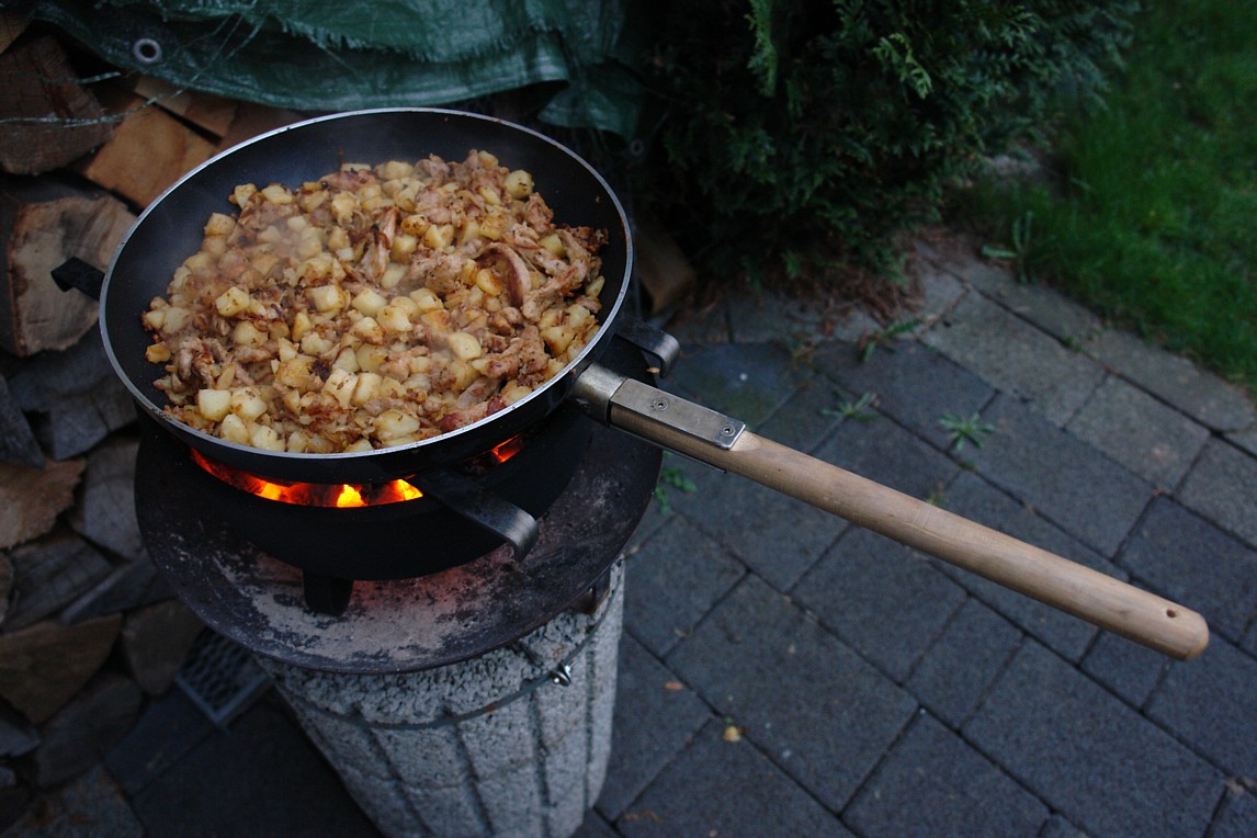 | Gyros mit Bratkartoffeln 1 zu 2 Super lecker! (Ein Teil Gyros, zwei Teile Bratkartoffeln) Zutaten: 400g Gyros (fertig gewürzt von Rewe) 800g vorgekochte Bratkartoffeln 2 Zwiebeln, Schnittlauch, 1 Knoblauch-Zehe ca. 80 ml Pflanzenöl Vorbereitung: Feuerstelle mit 5 Stück Hart-Holz-Briketts (vom Aldi) in Gang setzen und abbrennen lassen bis die offene Flamme hauptsächlich in Glut übergegangen ist. Während das Feuer vor sich hin brennt die Zwiebeln senkrecht halbieren (vom Kraut zur Wurzel) dann auf die flache Seite legen und in dünne Scheiben schneiden. Schnittlauch klein schneiden. Knoblauch klein schneiden. Öl in die kalte Pfanne geben bis der Boden komplett bedeckt ist. Flasche Zwickel Bier trinken. Noch eine Flasche Zwickel Bier trinken. So nun ist das Feuer aber runter gebrannt und wir können... Zubereiten: Pfanne auf die super heiße Glut der Feuerstelle stellen, Zwiebel rein, kurz glasig braten. Dann zügig Gyros und Kartoffel und Knoblauch in die Pfanne. Sofort alles durchmischen. Regelmäßig wenden ist ganz wichtig, denn die Feuerstelle hat eine menge Power. Alles braun braten. Schnittlauch drüber, fertig! Würzen braucht man nicht. Nur bei Bedarf kann jeder individuell etwas Salz drüber geben. |