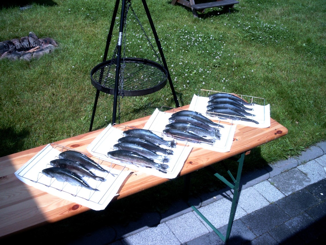 | Forelle Geräuchert Vorbereitung: Mit 2 Mann zum Olfener Angelteich fahren und mal eben 15 Forellen fangen.(das gelingt natürlich nur an Tagen wo es richtig richtig gut läuft) Forellen ausnehmen und in Salz-Laake (mit Gewürzmischung) einlegen. Eine Nacht lang ziehen lassen. Forellen aus der Laake nehmen und gründlich mit Küchentuch abtrocken. Forellen aufhängen und an der Luft weiter trocknen lassen bis die Haut trocken wie Zeitungspapier ist. Räucherofen auf 80°C anheizen. Fische reinhängen und über Buchenmehl ca 30 Minuten räuchern. (oder einfach fertig geräucherte Forellen am Angelteich bestellen und abholen) Dazu: - Salzkartroffeln - Spargel - Sauce Hollondaise - Wein Ein Hochgenuss! |