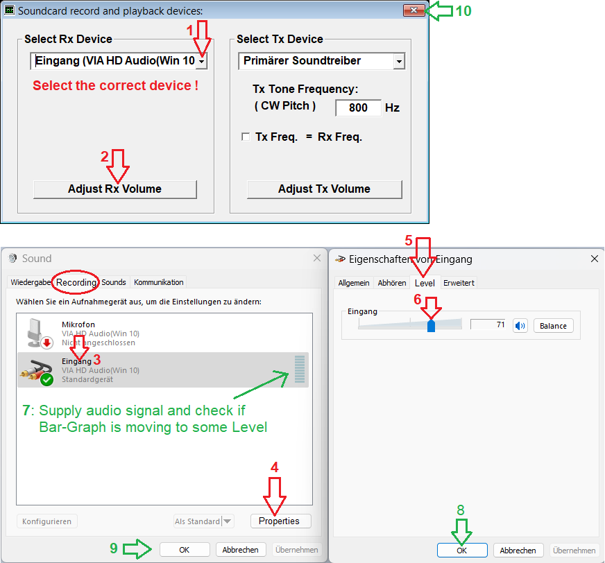When Volume setting is finished then feed MRP40 with reasonable Morse tone signals. Immediately you will see the dots and dashes on the Audio Band Display. Point with your mouse on that "Morse print" and click, immediately the two red lines will be placed there. The two red lines represent the center frequency and band width of the CW filter of MRP40. Fine tuning of center frequency will be done by MRP40 automatically. (AFC) The center frequency is displayed on the left side: xxxx Hz ( red )