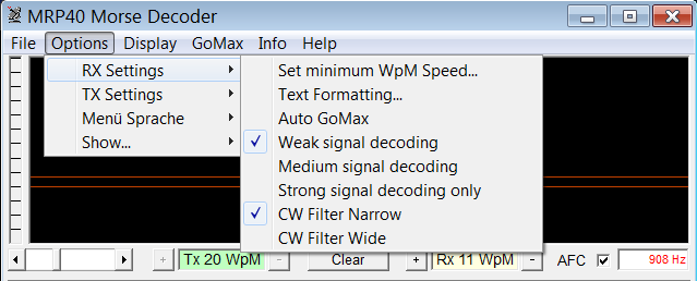 The internal Software CW filter is set to the minimum reasonable bandwidth to suppress all other near by (Noise) signals. Note: the bandwidth is automatically adapted, proportional to the receive speed (words per minute)